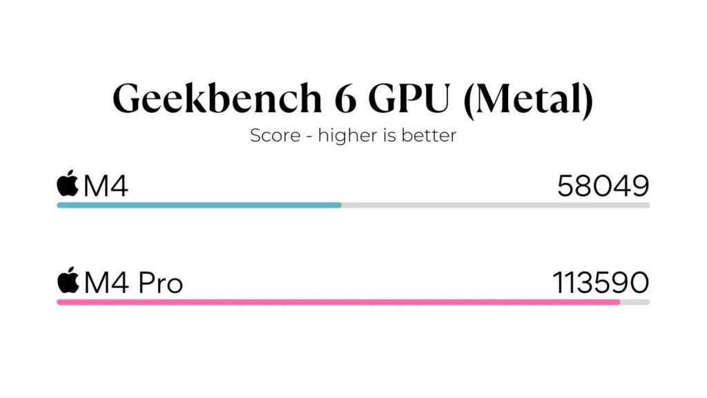 Geekbench 6 testinde M4 Pro günlük işlemlerde M4’e kıyasla daha iyi performans gösterdi. Tek çekirdek performansında M4’e göre yüzde 8 daha hızlıydı ve 3.966 puan aldı. M4 ise 3.816 puanla geride kaldı. Çoklu çekirdek testinde ise fark daha belirgindi. M4 Pro 22.605 puan alarak M4’ün 14.980 puanına göre yüzde 51 daha yüksek performans sundu.