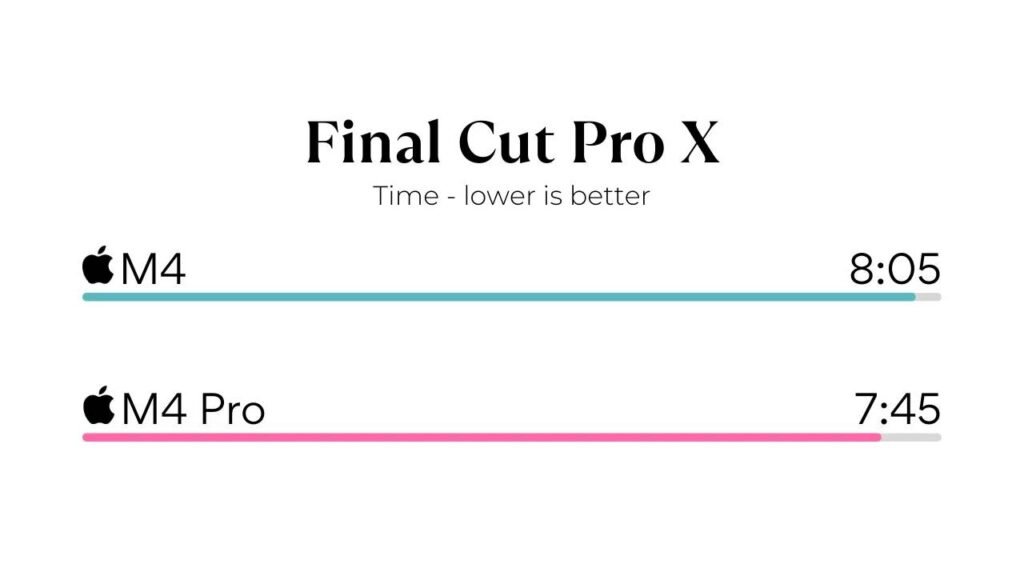 M4 ve M4 Pro aynı medya motorunu kullandıkları için video dışa aktarma süreleri neredeyse aynı seviyede kalıyor. M4 Pro biraz daha hızlı olsa da video düzenleme işlerinde büyük bir hız farkı bekleyenler için belirgin bir avantaj sunmuyor.
