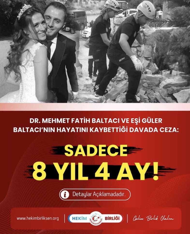Hekim Birliği Sendikası tarafından yapılan açıklamada, “Üyemiz Dr. Mehmet Fatih Baltacı ve eşi Güler Baltacı’nın yaşamını yitirdiği davada verilen 8 yıl 4 ay hapis cezasını kabul etmiyoruz”