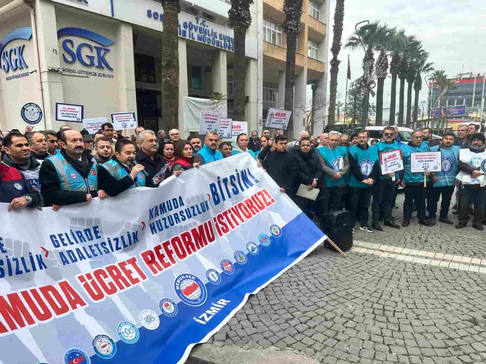 İzmir’de yapılan açıklamada, kamu çalışanlarının yaşadığı ücret adaletsizlikleri ve hükümetten talepler dile getirildi.